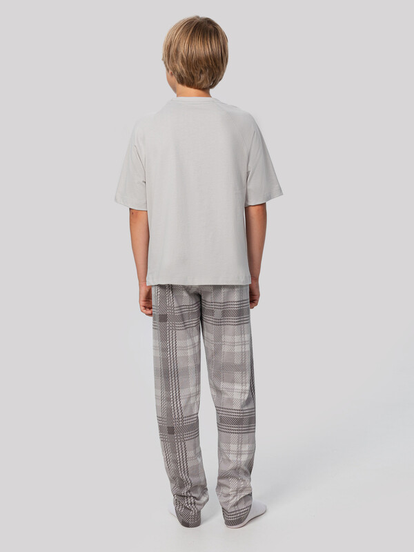 Этот домашний комплект для мальчиков — идеальное сочетание удобства, практичности и мягкости натуральных тканей. Он включает футболку и прямые брюки, выполненные из хлопка, который обеспечивает хорошую воздухопроницаемость и мягкость, особенно важные для активных детей. Футболка имеет классический круглый вырез с усиленной обтачкой из рибаны — она помогает сохранять форму даже после многократных стирок. Короткие рукава и низ футболки обработаны швом вподгибку, что придает изделию аккуратный и законченный вид. Брюки дополнены эластичным поясом, который мягко фиксируется на талии, не создавая дискомфорта. Прямой крой обеспечивает свободу движений, а застроченный низ делает их устойчивыми к износу. Комплект не только хорошо сидит, но и легко надевается — отличный выбор для дома, игр, сна или отдыха. Простота исполнения и качественные детали делают его универсальным вариантом на каждый день.