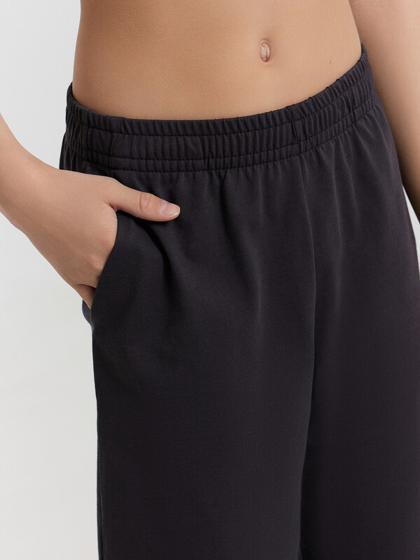 Шорты ниже колена, свободного силуэта с высокой посадкой на талии. Спереди карманы с отрезным бочком. Пояс цельнокроеный внутри с резиной 40RV. Низ шор в подгибку.