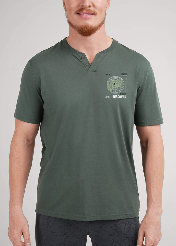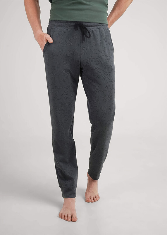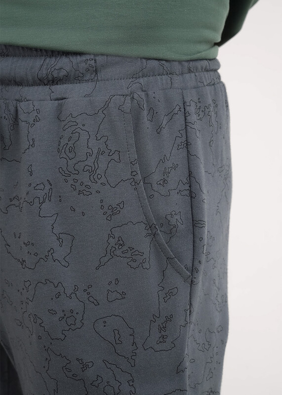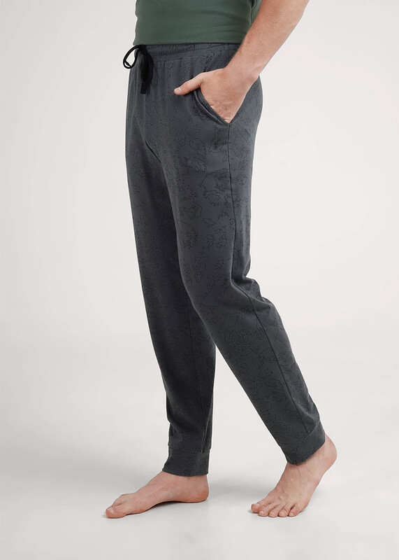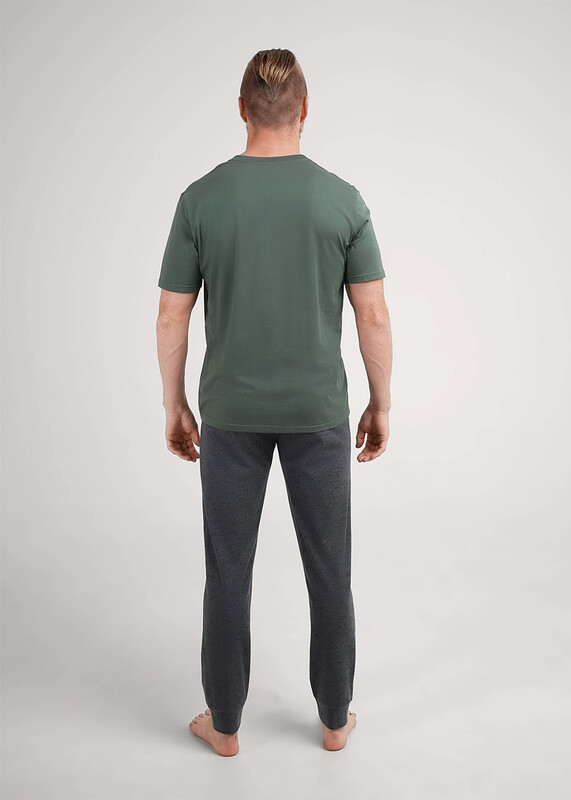 Комплект мужской состоящий из футболки и брюк. Футболка из трикотажного полотна с коротким рукавом и фигурной горловиной, спереди авторский принт. Брюки из трикотажа с набивкой на широком поясе с резинкой и регулируемым шнуром, по бокам удобные карманы.