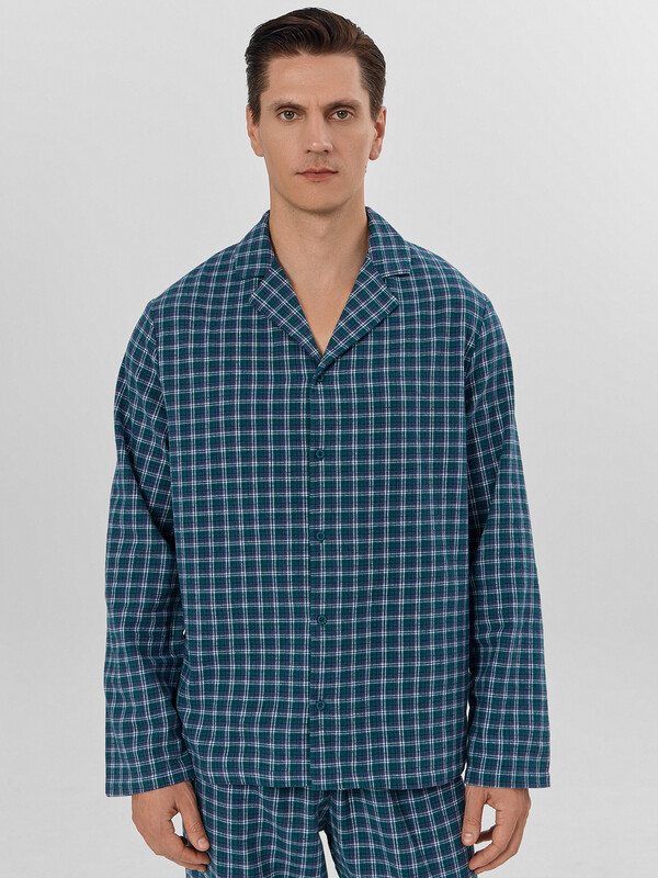 Мужской домашний комплект в классическую клетку станет идеальным спутником для отдыха. Пижама, состоящая из рубашки и брюк, выполнена из хлопка, который дарит коже приятные ощущения и обеспечивает комфорт весь день. Свободная рубашка прямого силуэта с V-образным вырезом и отложным воротником выглядит элегантно и не сковывает движений. Длинные рукава со спущенным плечом и аккуратно обработанными манжетами дополняют образ. Прямые брюки с удобным цельнокроеным поясом на эластичной тесьме мягко сидят по фигуре. Практичные боковые карманы и аккуратная обработка низа подчеркивают качество исполнения.