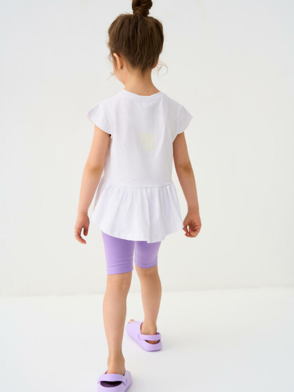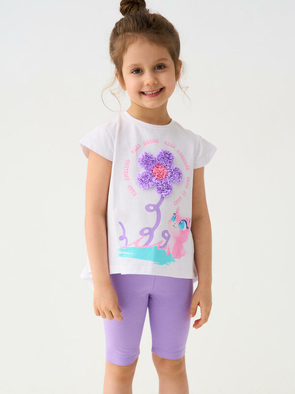 Детский комплект для девочки. Состоит из футболки прямого кроя, с короткими рукавами и укороченных легинсов. Футболка слегка удлиненная, с аккуратной сборкой внизу. На передней части размещен яркий декоративный рисунок с цветком и персонажем, дополненный объемной вышивкой, что делает модель выразительной и привлекательной. Легинсы облегающего силуэта, комфортно сидят по фигуре и хорошо тянутся. Пояс мягкий, на резинке, не сдавливает и подходит для активного движения.