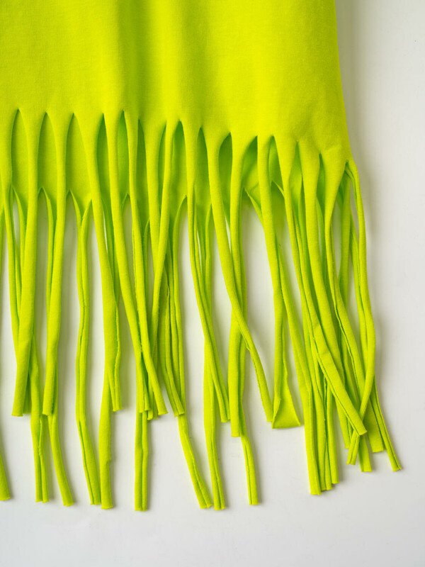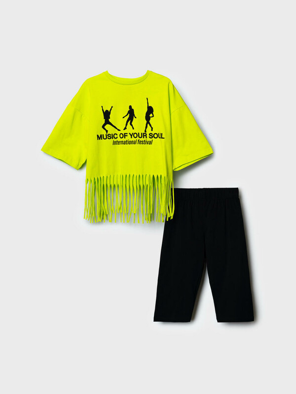 Комплект для девочки подростка. Состоит из яркой оверсайз футболки и укороченных легинсов. Футболка из хлопкового трикотажа джерси, с короткими рукавами и круглой горловиной. Главный акцент — крупный принт и бахрома по низу. На спинке под горловиной расположена стильная нашивка. Легинсы выполнены из мягкого трикотажа джерси, имеют облегающую посадку и удобный пояс на резинке.