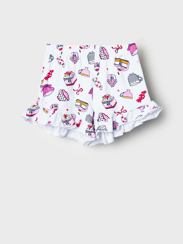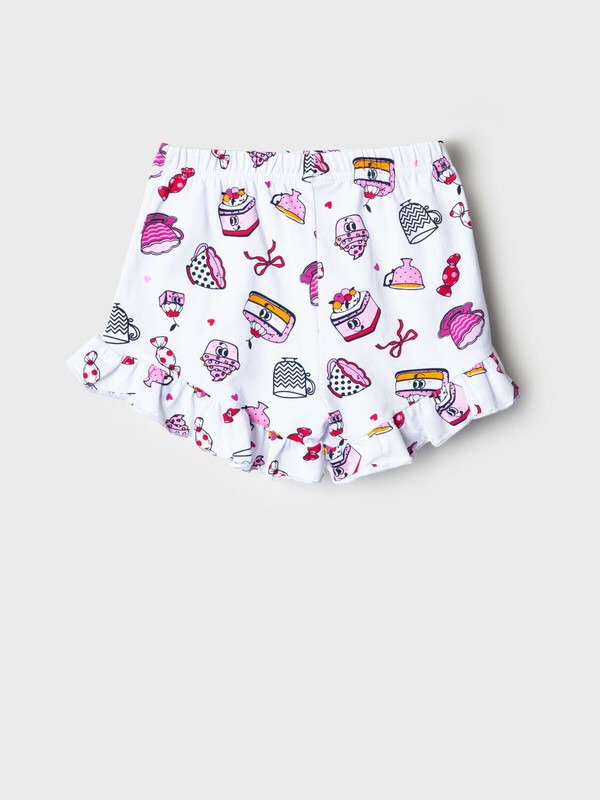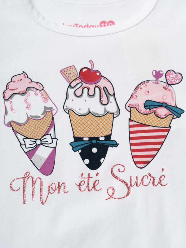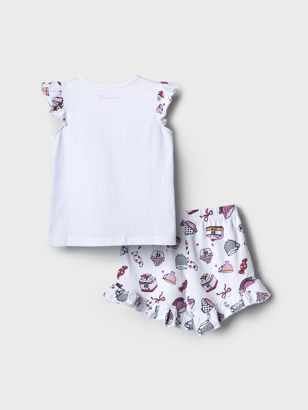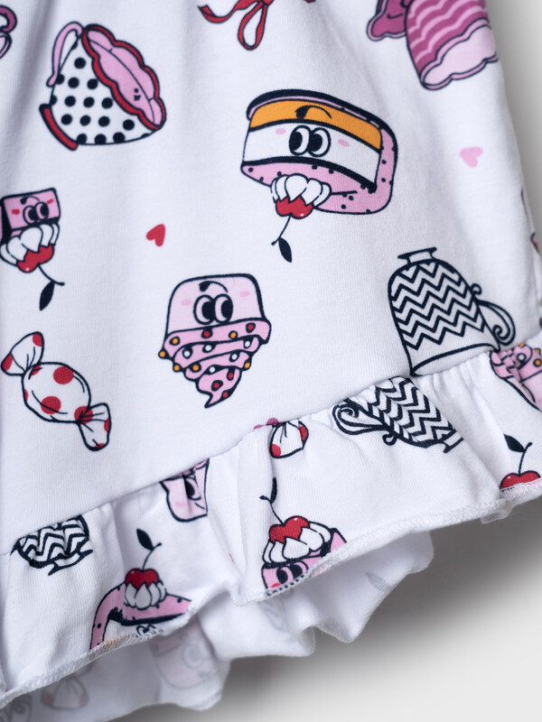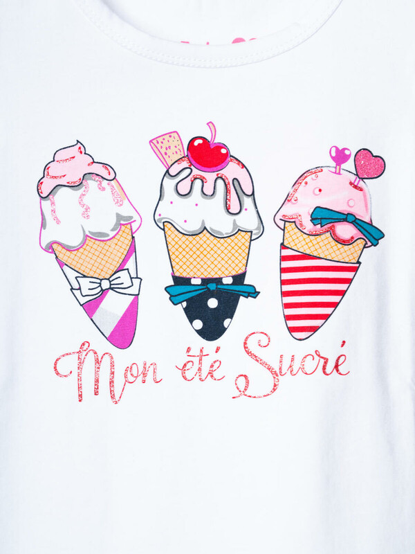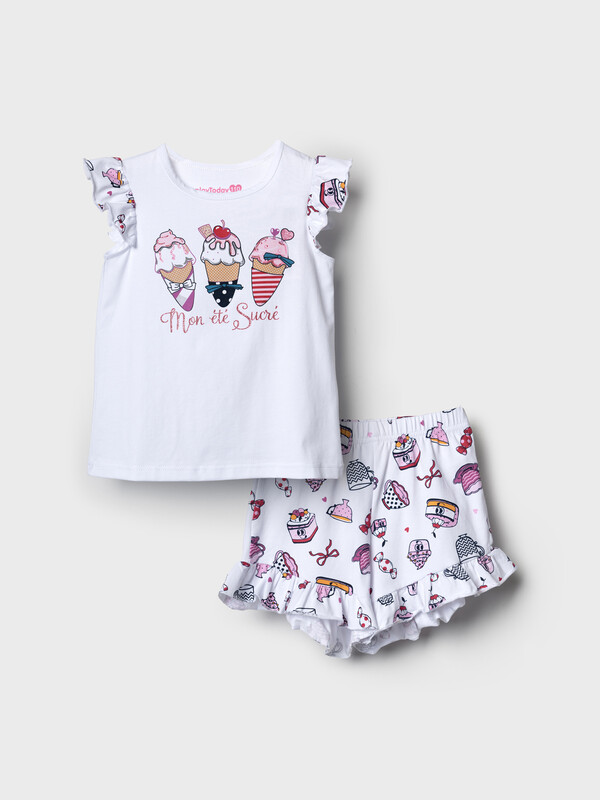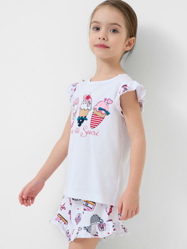 Пижама детская для девочки. Комплект для девочки из футболки, прямого кроя и шорт с ярким летним дизайном. Футболка белого цвета с милым принтом мороженого. Рукава украшены оборками. Шорты на резинке, с расклешённым низом и воланами по краю. Материал - хлопковый, дышащий трикотаж.