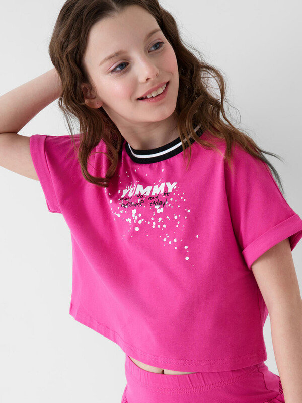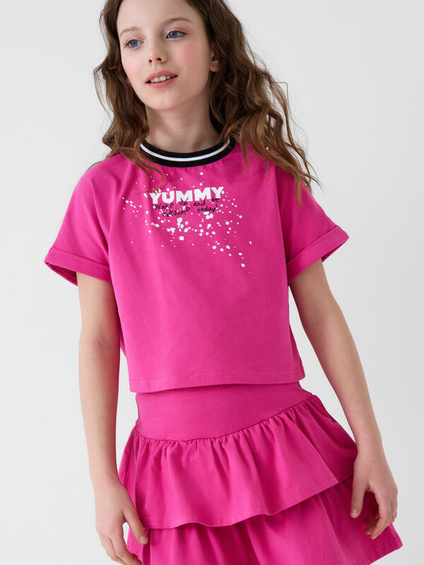 Легкий комплект для девочки подростка. Выполнен из мягкого хлопкового трикотажа джерси, состоящий из укороченной футболки и юбки-шорт. Футболка свободного кроя с ярким принтом. Пышная юбка на резинке с воланами, внутри имеет удобные шорты, что делает модель практичной для активного отдыха.