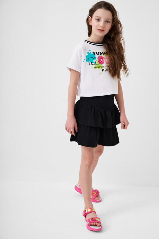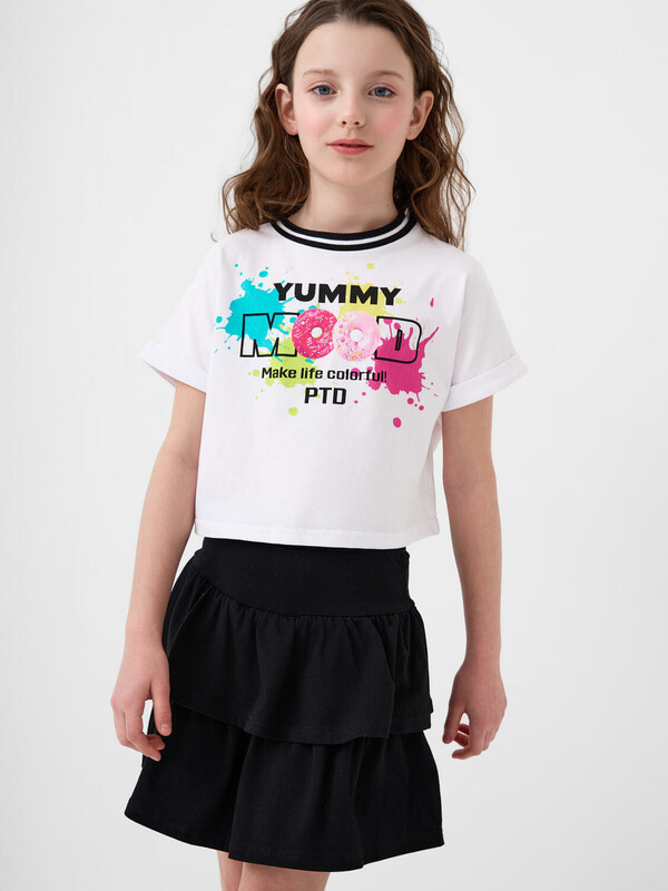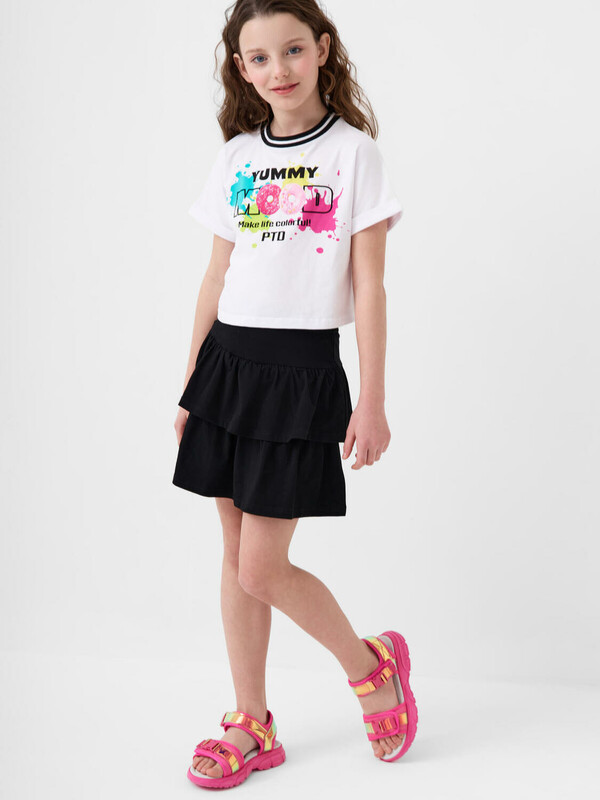 Легкий комплект для девочки подростка. Выполнен из мягкого хлопкового трикотажа джерси, состоящий из укороченной футболки и юбки-шорт. Футболка свободного кроя с ярким принтом. Пышная юбка на резинке с воланами, внутри имеет удобные шорты, что делает модель практичной для активного отдыха.