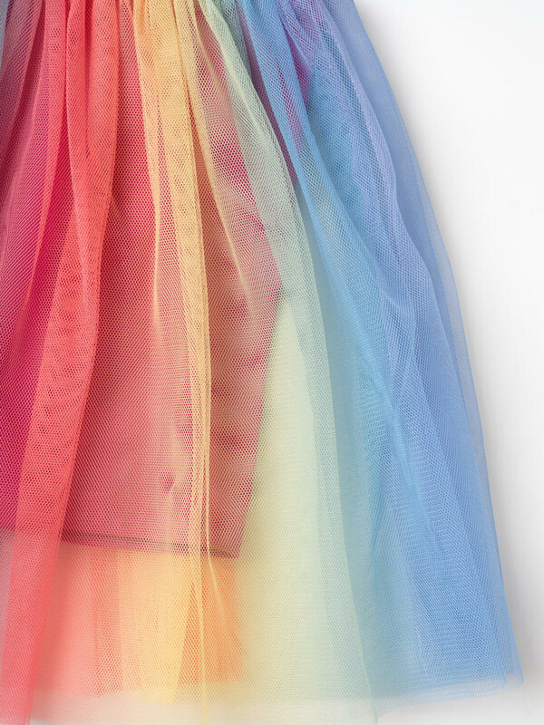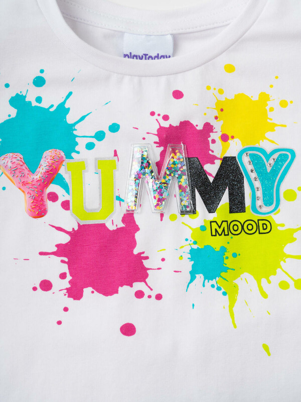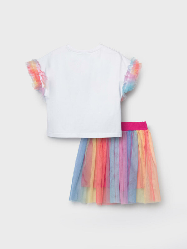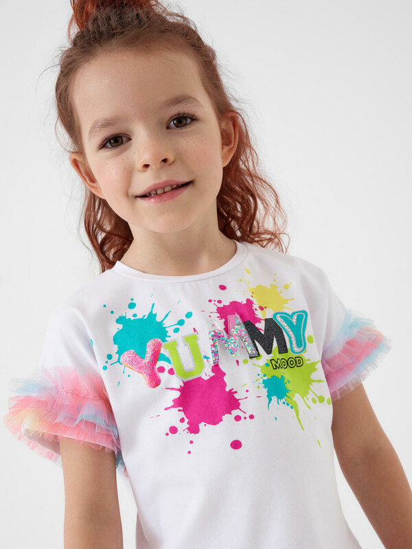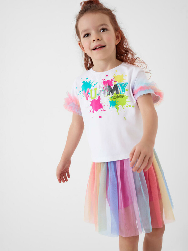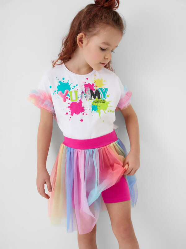 Яркий детский трикотажный комплект для девочки. Состоит из футболки и юбки-шорт. Футболка прямого кроя, с короткими рукавами украшена эффектным принтом. Главный акцент — объемные рукава с многослойными воланами из легкой сетки. Юбка-шорты выполнена в том же стиле: сверху — пышная сетчатая юбка с градиентным принтом, снизу — удобные трикотажные шорты. Пояс на мягкой резинке обеспечивает комфортную посадку.