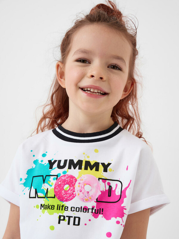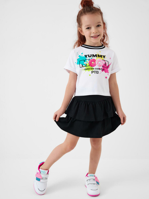 Легкий детский комплект для девочки. Выполнен из мягкого хлопкового трикотажа джерси, состоящий из укороченной футболки и юбки-шорт. Футболка свободного кроя с ярким принтом. Пышная юбка на резинке с воланами, внутри имеет удобные шорты, что делает модель практичной для активного отдыха.
