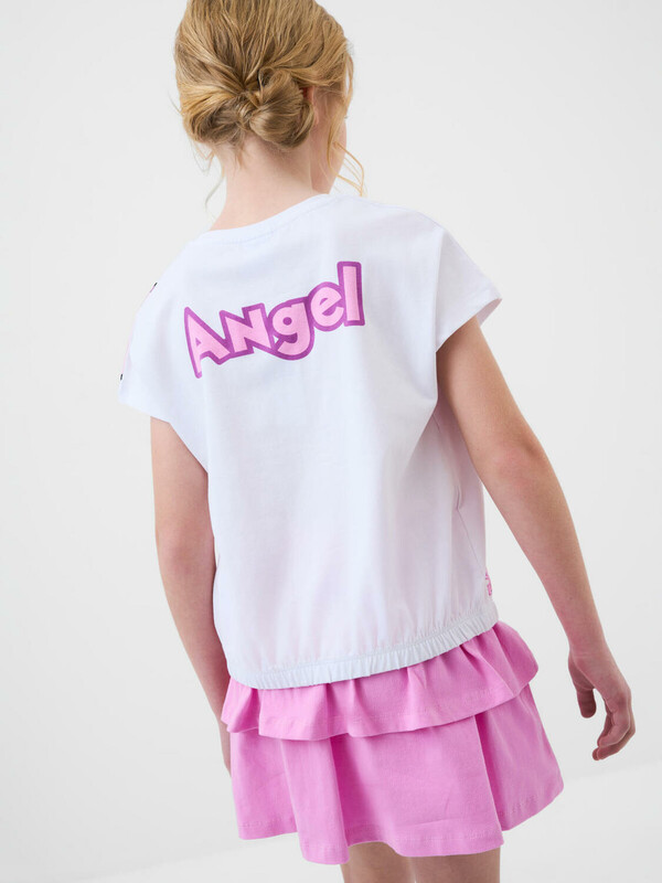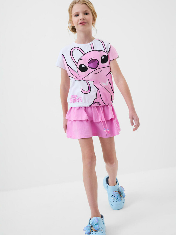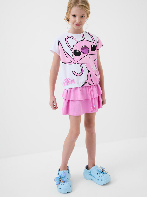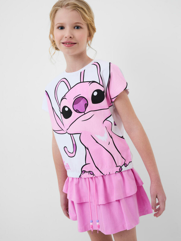 Легкий комплект для девочки подростка. Выполнен из мягкого хлопкового трикотажа джерси, состоящий из футболки и юбки-шорт. Футболка свободного кроя с резинкой по низу, украшена ярким принтом любимого мультяшного персонажа из "Лило и Стич". Пышная юбка на резинке со шнурком украшена воланами, внутри имеет удобные шорты, что делает модель практичной для активного отдыха. Декоративные бусины на шнурке для регулировки.