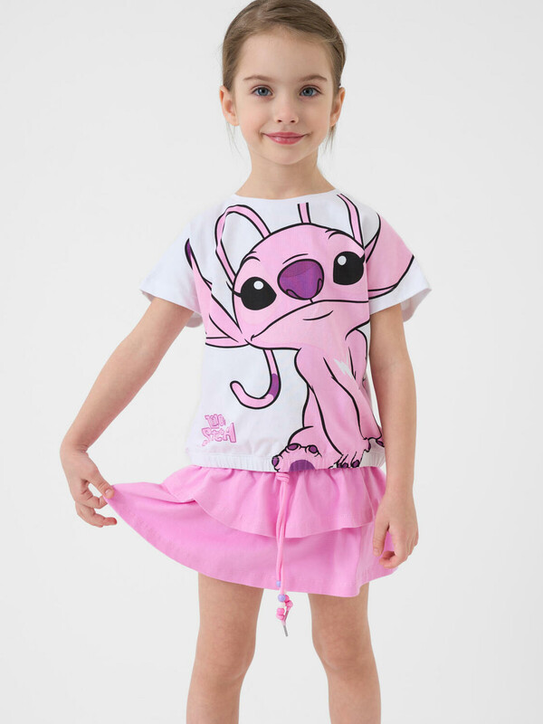 Легкий детский комплект для девочки. Выполнен из мягкого хлопкового трикотажа джерси, состоящий из футболки и юбки-шорт. Футболка свободного кроя с резинкой по низу, украшена ярким принтом любимого мультяшного персонажа из "Лило и Стич". Пышная юбка на резинке со шнурком украшена воланами, внутри имеет удобные шорты, что делает модель практичной для активного отдыха. Декоративные бусины на шнурке для регулировки.