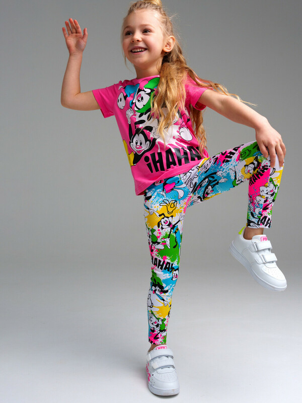 Комплект: футболка regular fit, легинсы из качественного и приятного на ощупь трикотажа джерси. Высокое содержание хлопка. Благодаря наличию эластана в составе ткани изделие проще в уходе и держит форму. Эластичный пояс.