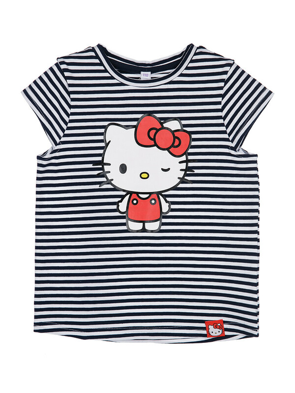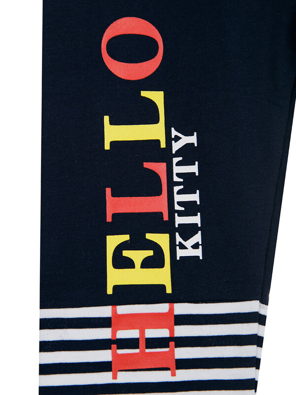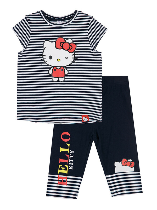 Комплект: футболка с принтом Hello Kitty, легинсы. Выполнен из качественного эластичного и приятного на ощупь трикотажа джерси с высоким содержанием хлопка 95%. Благодаря наличию эластана в составе ткани изделие держит форму и меньше мнется.