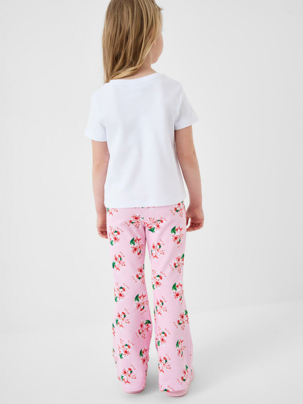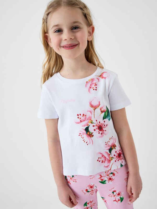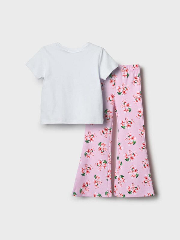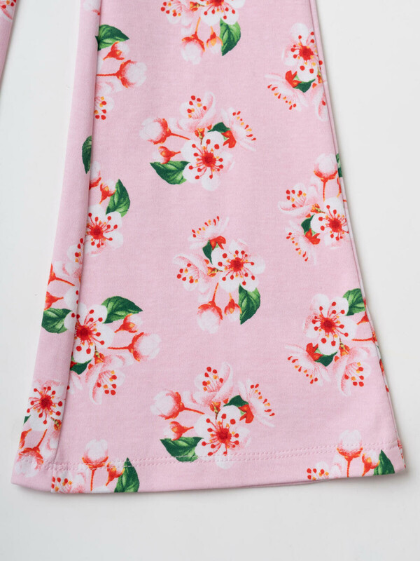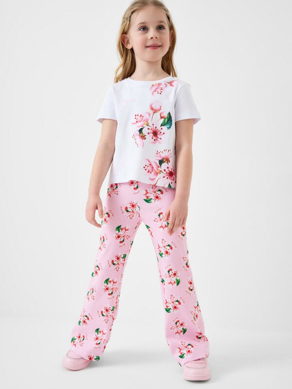 Детский комплект для девочки. Состоит из футболки и брюк клеш на резинке. Выполнен из хлопкового трикотажа. Футболка прямого силуэта, с короткими рукавами. Украшена нежным цветочным принтом. Брюки — расклешенные с эластичным поясом.