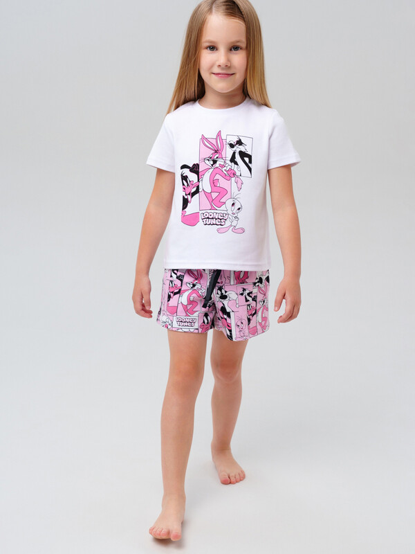 Комплект трикотажный для девочек: фуфайка (футболка), шорты (110, белый,розовый)(PlayToday)