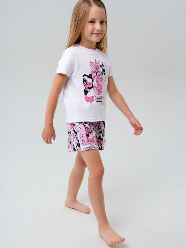 Комплект трикотажный для девочек: фуфайка (футболка), шорты (98, белый,розовый)(PlayToday)