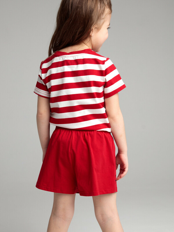 Комплект: футболка и шорты из качественного эластичного и приятного на ощупь трикотажа. Посадка regular fit – классический крой. Застежка на кнопки на плече. Пояс со шнурком. Высокое содержание хлопка 95%. Благодаря наличию эластана в составе ткани изделие держит форму и меньше мнется.