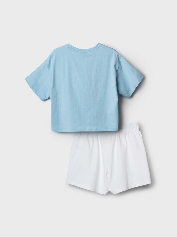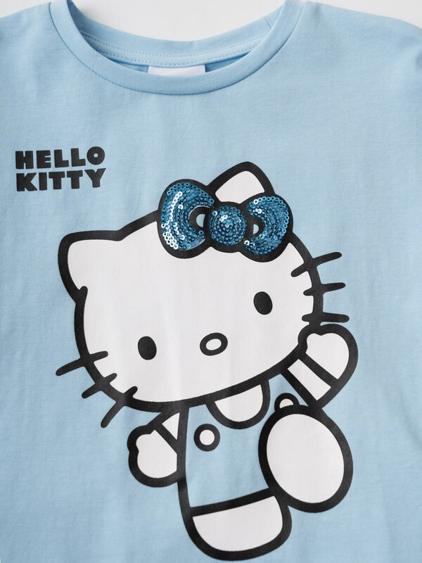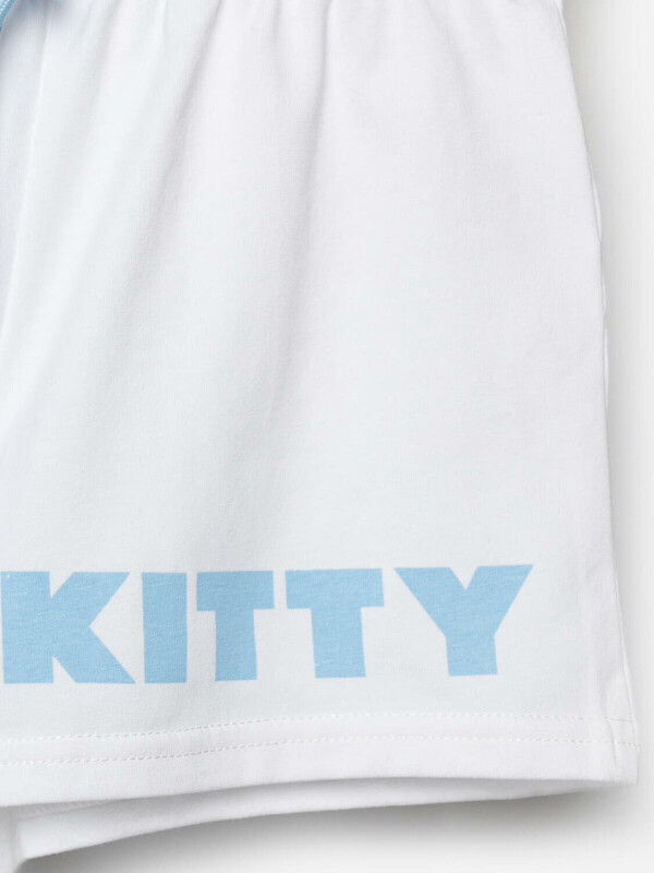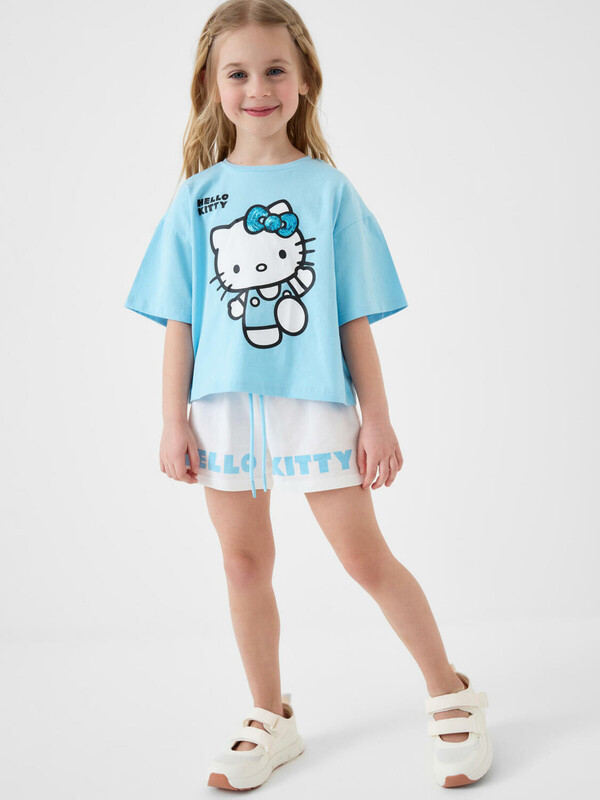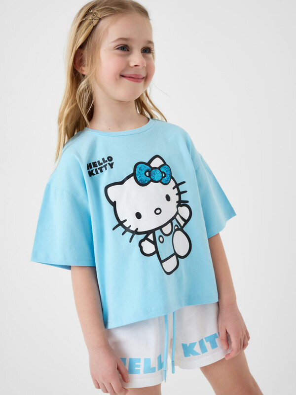 Детский костюм для девочки. Состоит из футболки и шорт. Выполнен из хлопкового трикотажа. Футболка оверсайз, с коротким рукавом. Яркий принт с любимым персонажем "Hello Kitty". Шорты свободные, с эластичным поясом и шнурком для регулировки посадки.