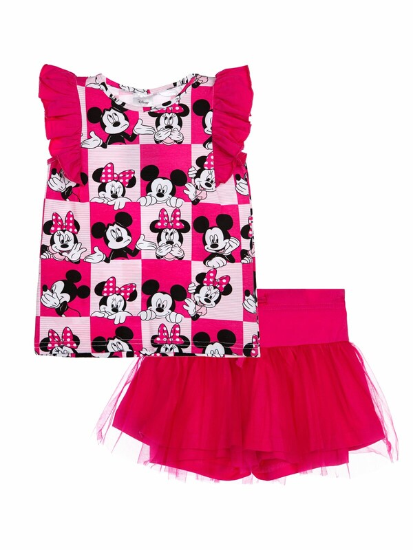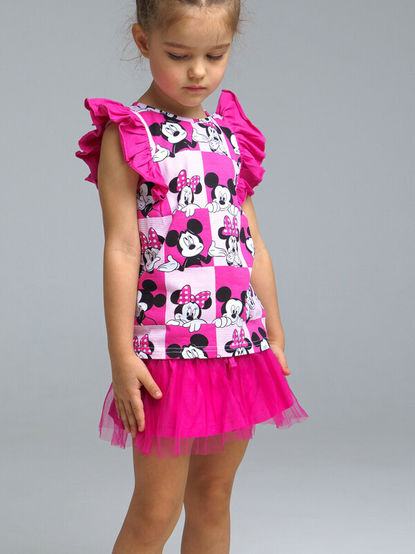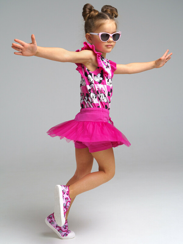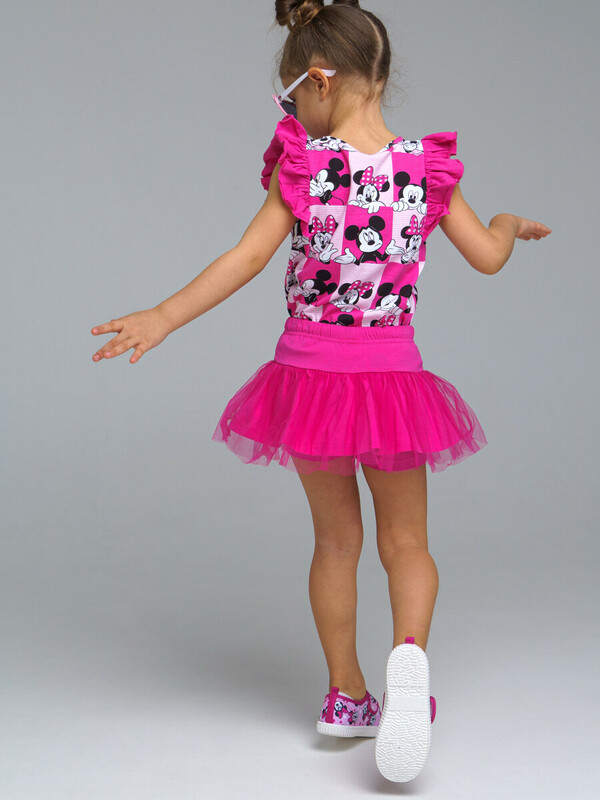 Комплект трикотажный с персонажем Disney: футболка, юбка-шорты. Высокое содержание хлопка 95%. Благодаря наличию эластана в составе ткани изделие проще в уходе и держит форму. Принт сохраняет первоначальный вид даже после многочисленных стирок. Оптимальная посадка: юбка-шорты не сползают при движении. Эластичный пояс со шнурком. Карманы.