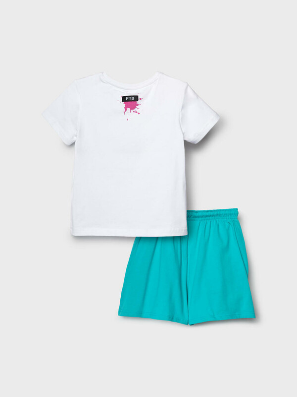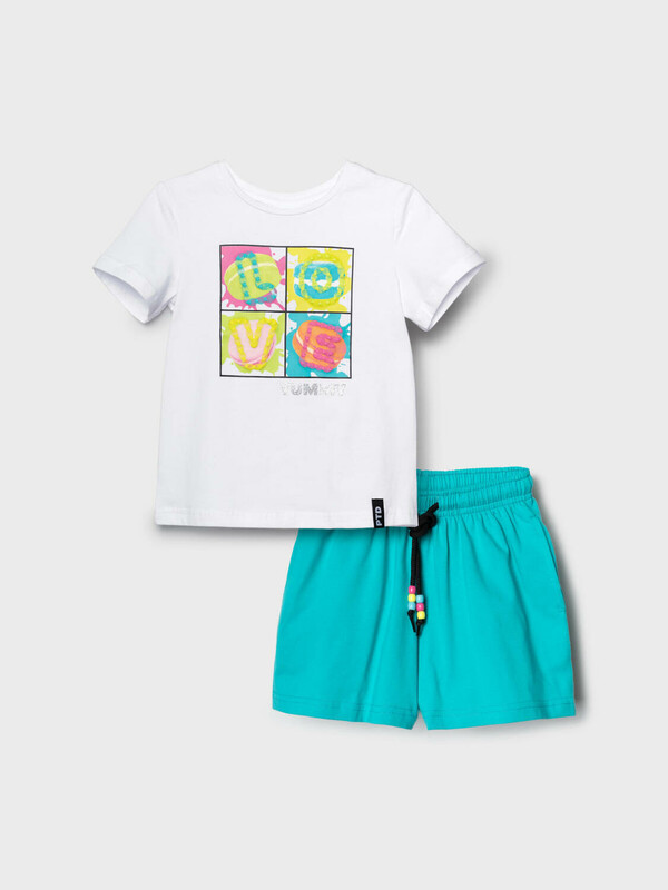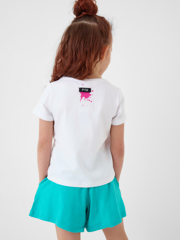 Детский костюм для девочки. Состоит из футболки с коротким рукавом и шорт. Выполнен из хлопкового трикотажа. Футболка прямого кроя, с красочным принтом и нашивкой. Шорты свободные, короткие, хорошо сидят на талии благодаря эластичному поясу и регулирующему шнурку. Удобные боковые карманы.