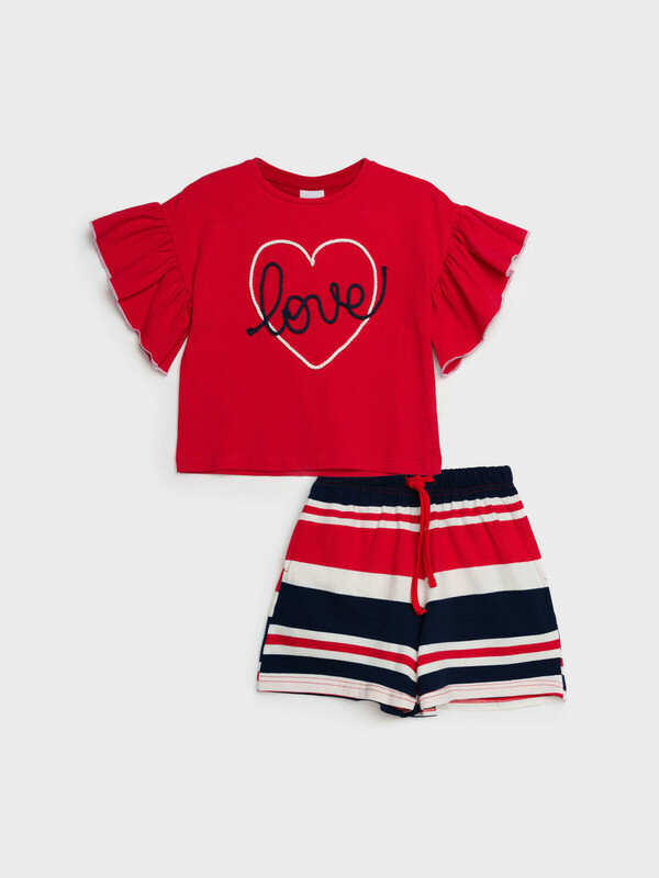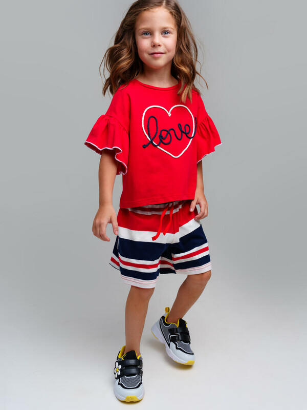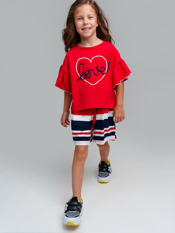 Костюм детский для девочки. Комплект оверсайз: футболка, шорты с высоким содержанием хлопка 95%. Благодаря наличию эластана в составе ткани изделие проще в уходе и держит форму. Шорты на резинке со шнурком. Боковые карманы. Модель выполнена из качественного и приятного на ощупь трикотажа.