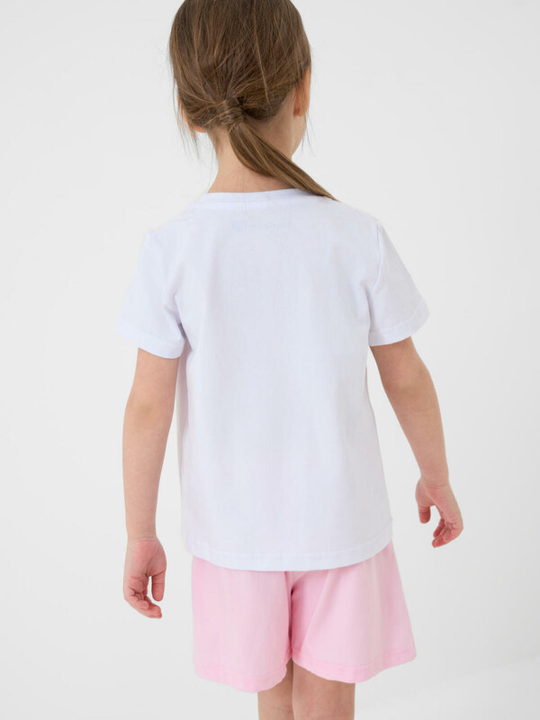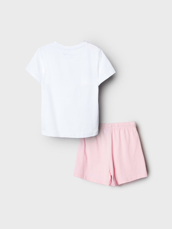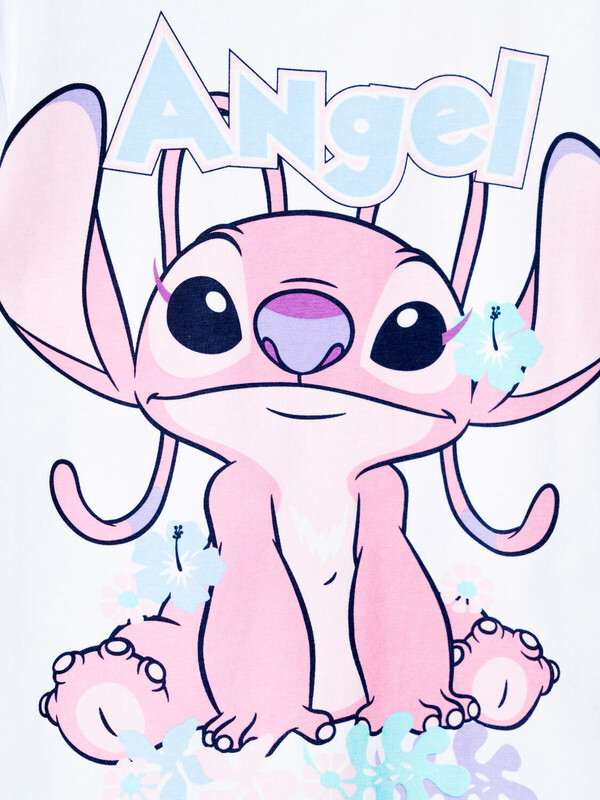 Детская пижама для девочки. Комплект состоит из белой футболки, прямого кроя с короткими рукавами и светло-розовых шорт. На футболке — крупный цветной принт с изображением Лило и Стич. Шорты на резинке, дополнены декоративным шнурком на поясе. Материал — легкий, хлопковый трикотаж, приятный для тела.