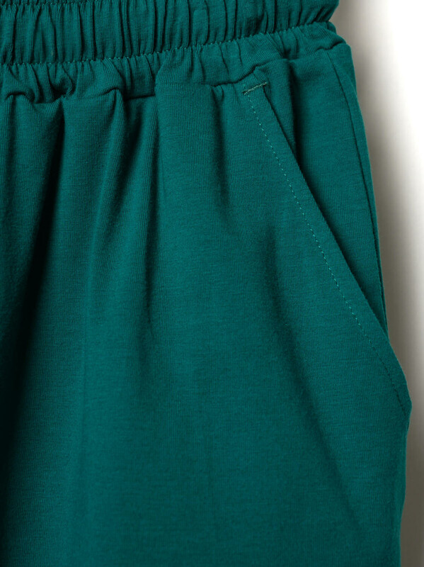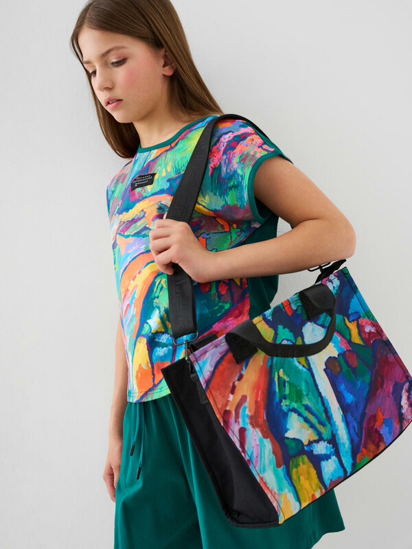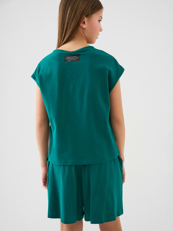 Костюм для девочки подростка. Состоит из футболки и шорт. Выполнен из хлопкового трикотажа. Футболка оверсайз, с коротким рукавом. На принте изображён фрагмент абстрактной живописной композиции Василия Кандинского — из работы «Импровизация 7». Шорты свободные, с эластичным поясом и шнурком для регулировки посадки. По бокам расположены карманы. Можно составить family look cо взрослым вариантом аналогичного дизайна.