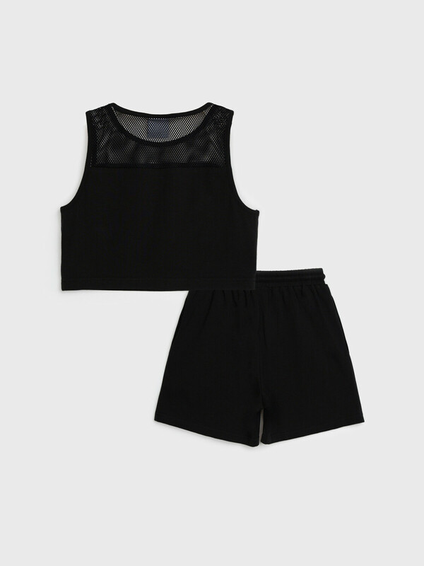 Костюм для девочки подростка. Футболка, шорты из эластичного и приятного на ощупь трикотажа джерси. Шорты на резинке со шнурком. Функциональные боковые карманы. Высокое содержание хлопка. Декор из сетки. Модель выполнена из качественного и приятного на ощупь трикотажа.