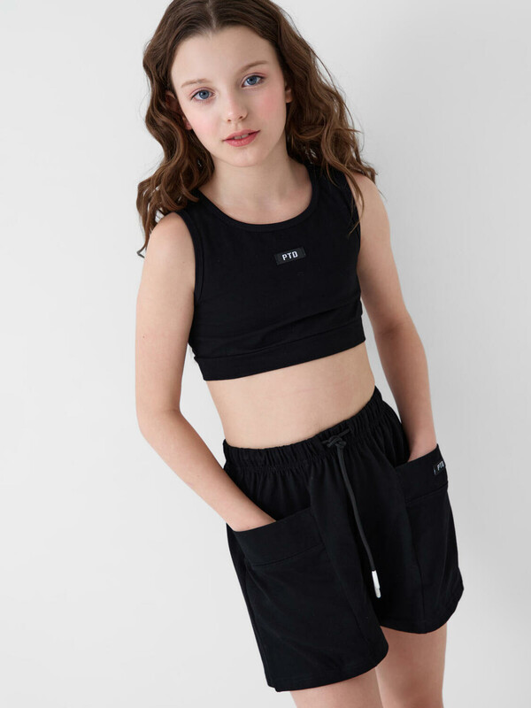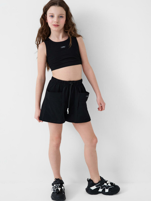 Стильный комплект для девочки подростка. Состоит из топа и шорт, выполненных из мягкого хлопкового трикотажа. Топ украшен ярким принтом. Шорты с эластичным поясом и шнурком для регулировки. Удобные боковые карманы.
