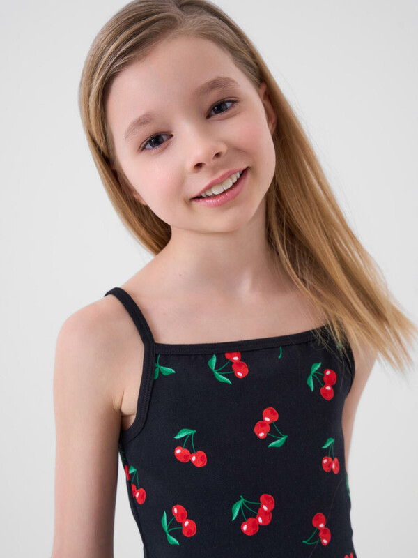 Комплект для девочки подростка. Включает топ и шорты, выполненные из мягкого хлопкового трикотажа с ярким принтом вишен. Топ с тонкими бретелями. Шорты имеют эластичный пояс с завязками для удобной регулировки посадки. Удобные боковые карманы.