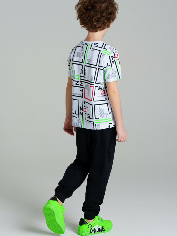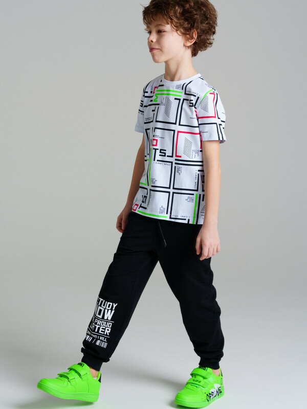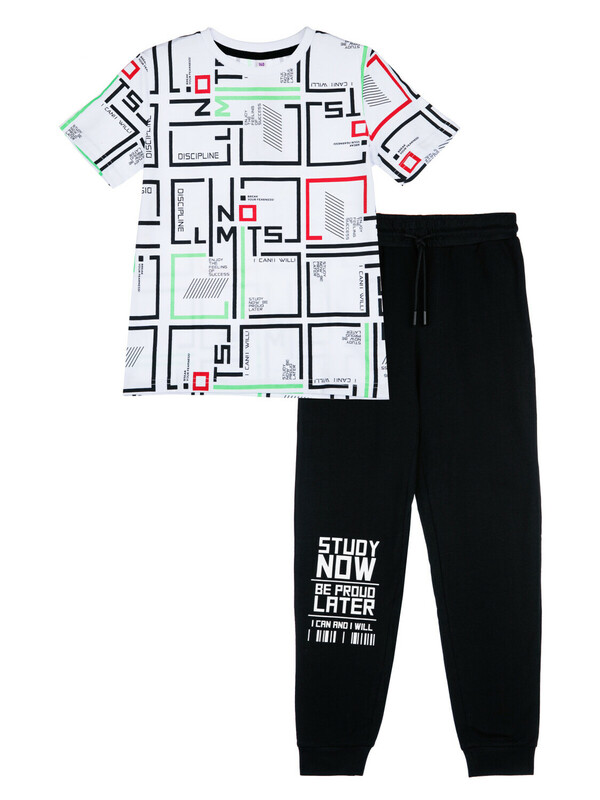 Комплект: футболка, брюки regular fit. Футболка классического прямого силуэта. Высокое содержание хлопка 95%. Благодаря наличию эластана в составе ткани, изделие проще в уходе и держит форму. У брюк функциональные карманы. Эластичный пояс со шнурком.