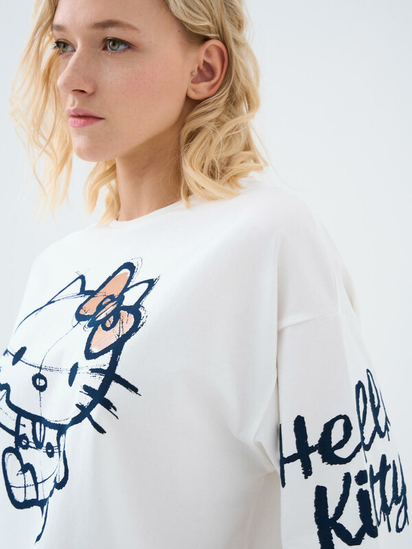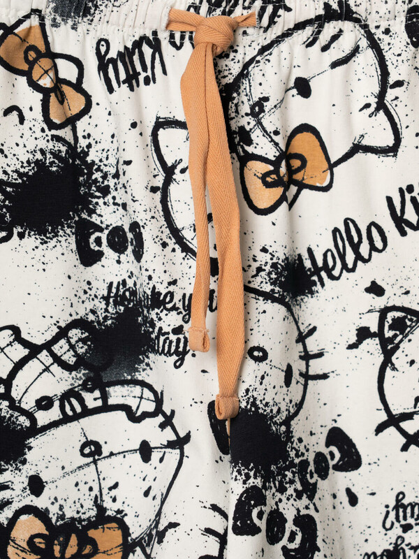 Женской костюм. Состоит из футболки и шорт. Выполнен из хлопкового трикотажа. Укороченная футболка оверсайз, с коротким рукавом. Яркий принт с любимым персонажем "Hello Kitty". Шорты свободные, с эластичным поясом и шнурком для регулировки посадки. По бокам расположены карманы. Можно составить family look c детским вариантом аналогичного дизайна.