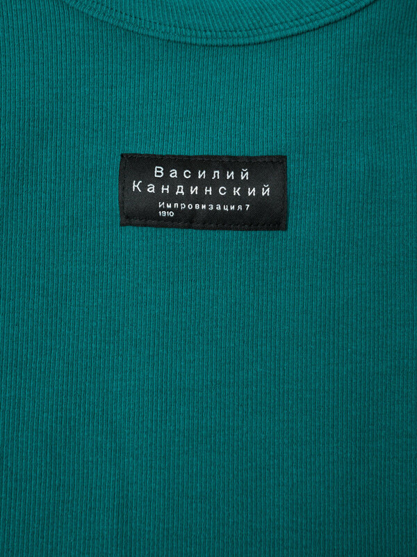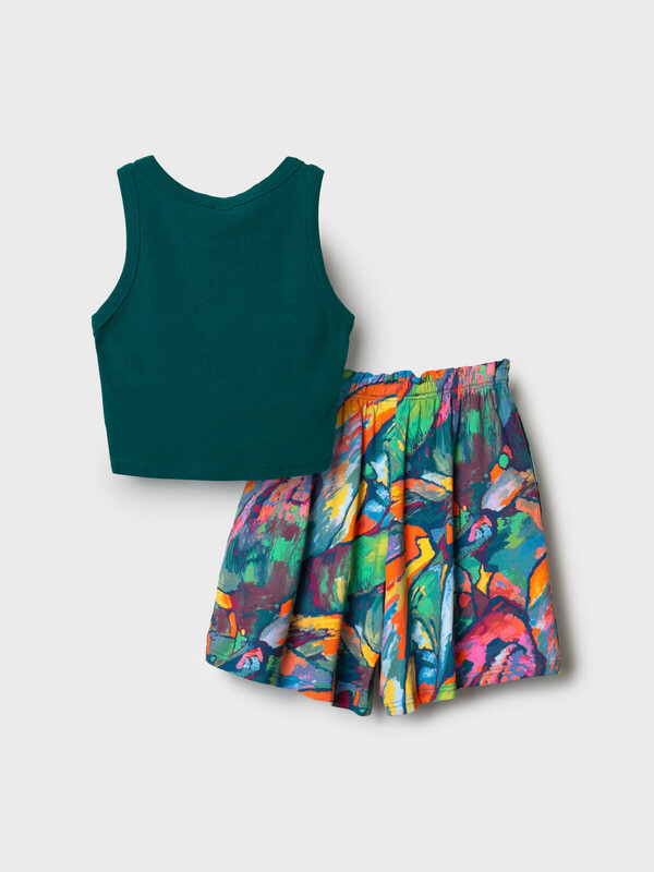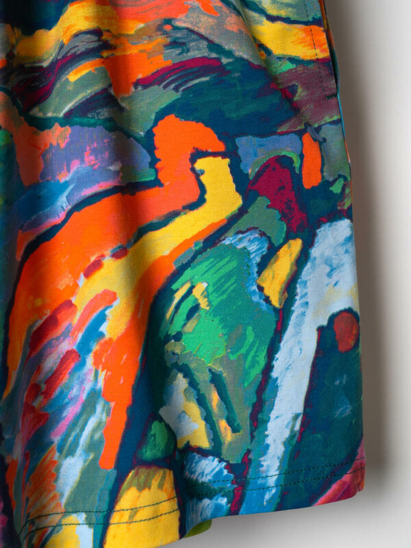 Летний женский комплект. Состоит из укороченной майки и шорт с ярким художественным принтом. Майка выполнена из мягкого риба и украшена чёрной нашивкой. Шорты выполнены из тонкого хлопкового трикотажа. Принт на шортах выполнен на основе картины Василия Кандинского «Импровизация 7». Это абстрактная живописная композиция, созданная художником в 1910 году. Они имеют эластичный пояс с завязками и боковые карманы. Можно составить family look с детским вариантом аналогичного дизайна.