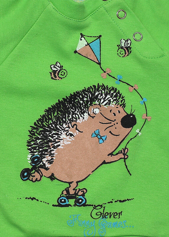 Комплект из комфортного пластичного трикотажа (интерлока).Горловина с обтачкой и застежкой на кнопки по пройме. Толстовка и брюки с манжетами по низу из отделочного полотна.Перед украшен принтом. Пояс брюк с резинкой