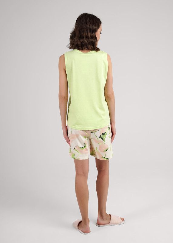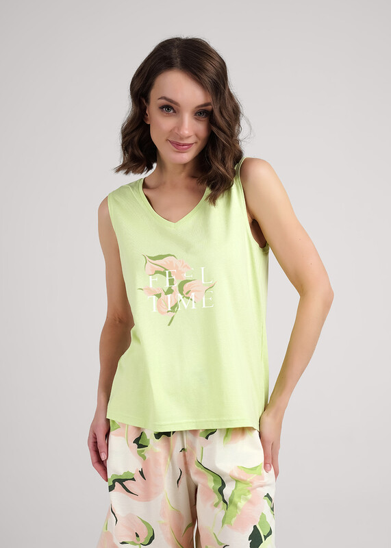 Комплект из хлопкового трикотажного полотна с добавлением модала. Футболка с удлиненной спинкой без рукавов, широкое плечо. Горловина с обтачкой. Спереди, сзади принт. Шорты длинные,свободные. По талии пояс на резинке. Боковые карманы с отрезным бочком.