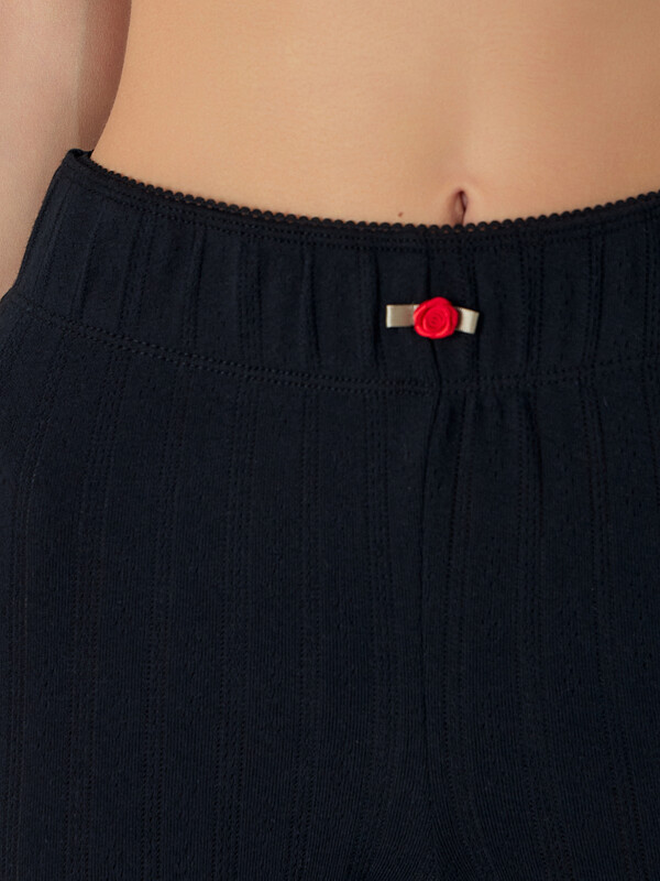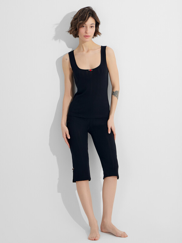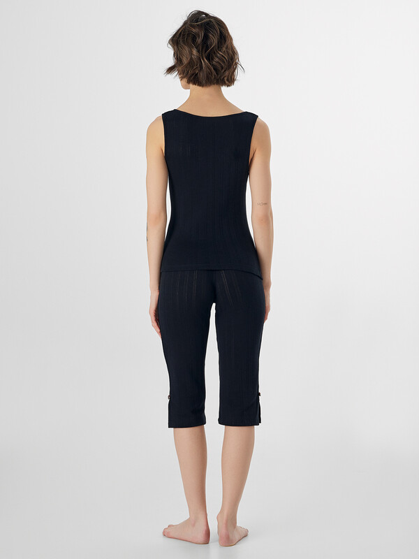 Домашний комплект — это элегантный набор из блузы на широких бретелях и бриджей. Выполнен из мягкого хлопкового трикотажа с фактурой рибана и создан для комфортного отдыха дома.
