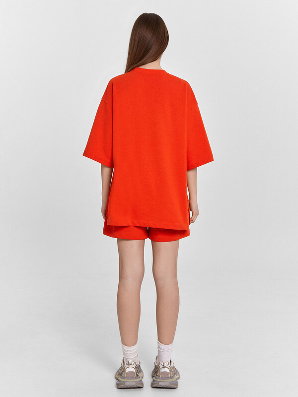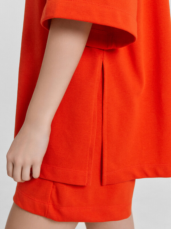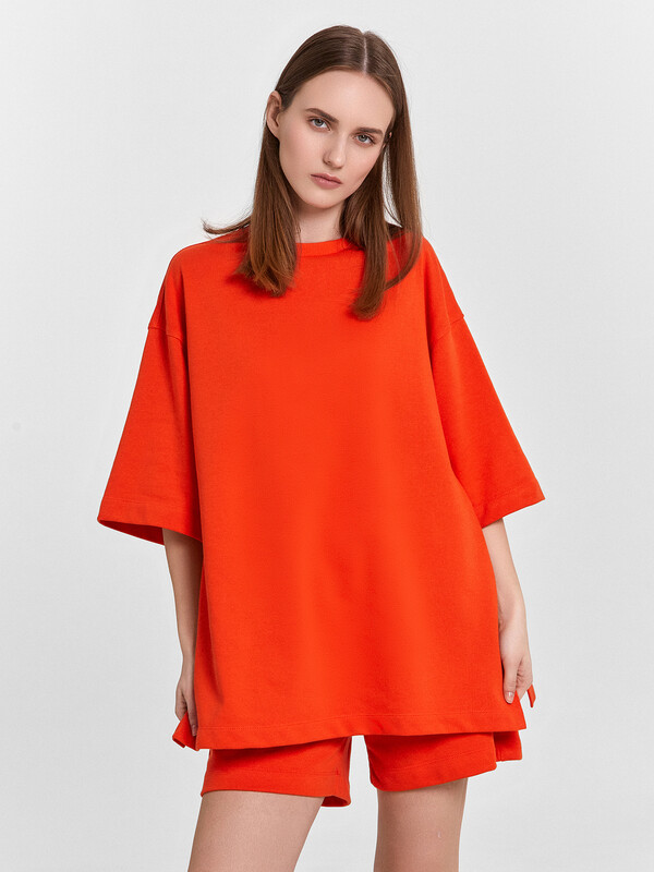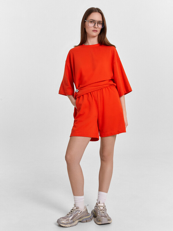 Блуза женская свободного силуэта из трикотажного полотна футер. Горловина круглой формы, обтачка горловины из рибаны. Шов горловины спинки закрыт хб тесьмой. Плечо спущено, пройма углублена, рукав втачной удлиненный. По плечу и пройме проложены отделочные строчки. Блуза удлинена, с разрезами в боковых швах. Шорты женские свободного силуэта из трикотажного полотна футер. Пояс цельнокроеный с эластичной тесьмой внутри. На внутренней стороне пояса пробиты петли и вставлен шнур 10мм, (ШНУР 10PX-1). В боковых швах обработаны карманы.