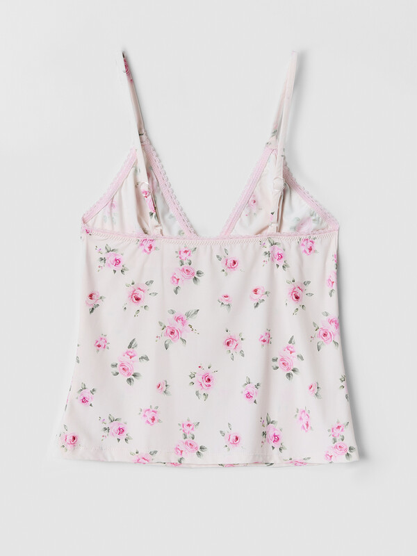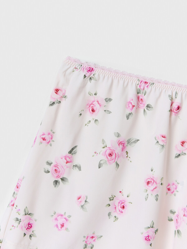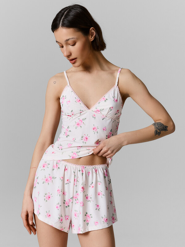 Комплект женский состоит из блузы и шорт. Блуза прилегающего силуэта, на тонких бретелях. Горловина V-образной формы. По переду фигурный подрез под грудью, по лифу застрочены вытачки. Лиф на подкладке из основного полотна. Бретели выполнены из основного полотна с регулировкой на кольца и регуляторы (8мм пластик). По горловине и проймам притачана эластичная тесьмас зубом 11 мм (06/11) KTE11-11 (Arteks Е2510). Нижний срез обработан швом вподгибку. Шорты прямые, свободные. Посадка средняя. По верхнему срезу притачана эластичная тесьма с зубом 11 мм (06/11) KTE11-11 (Arteks Е2510). Нижний срез обработан швом вподгибку.