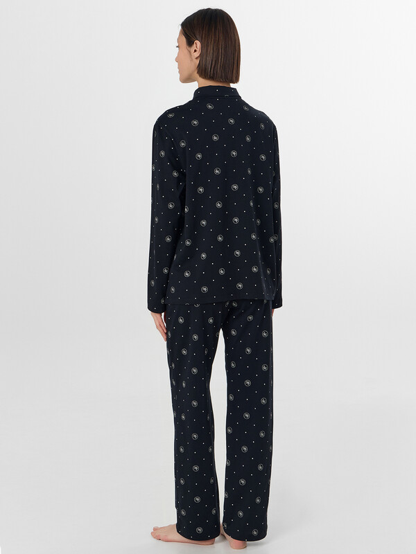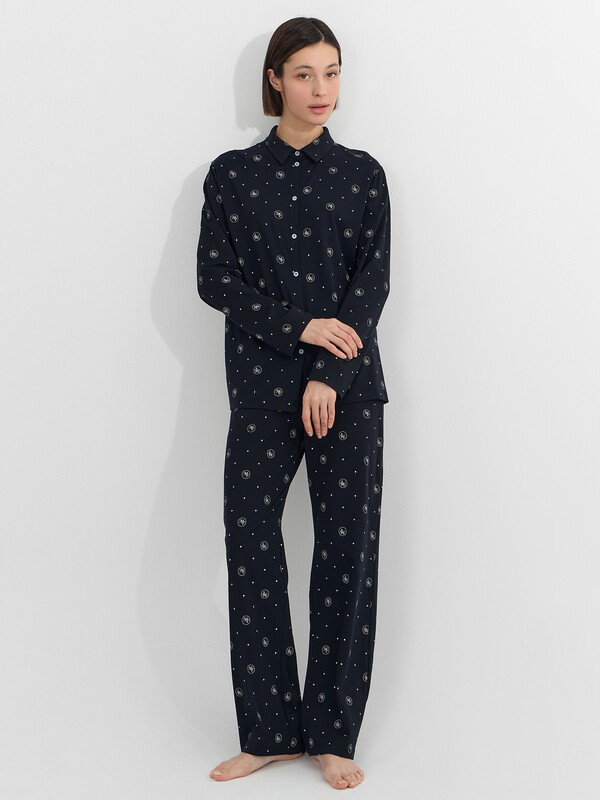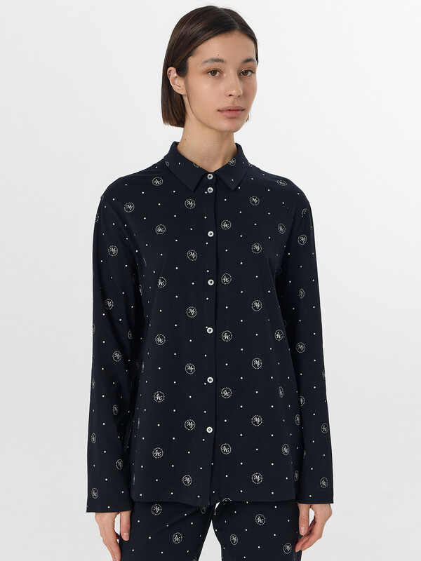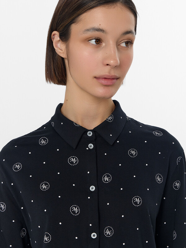 Комплект состоит из блузки и брюк, блузка на базе 592368. Силуэт блузки прямой и свободный, рукава длинные втачные, линия плеча немного спущена. Блуза с центральной застежкой на пуговицы, воротник стояче-отложной.Низ изделия и низ рукавов застрочен швом в подгибку.
