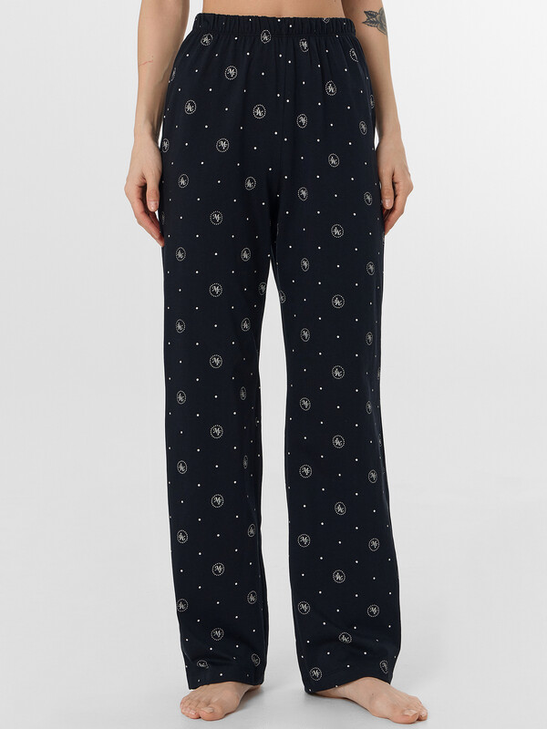 Брюки с посадкой на талии свободного силуэта. Пояс цельнокроеный с резиной внутри. Низ изделия застрочен швом в подгибку.