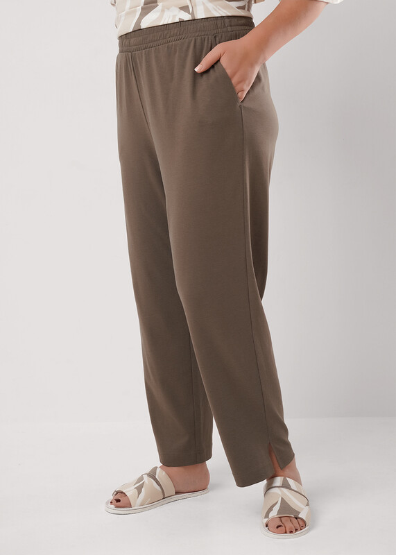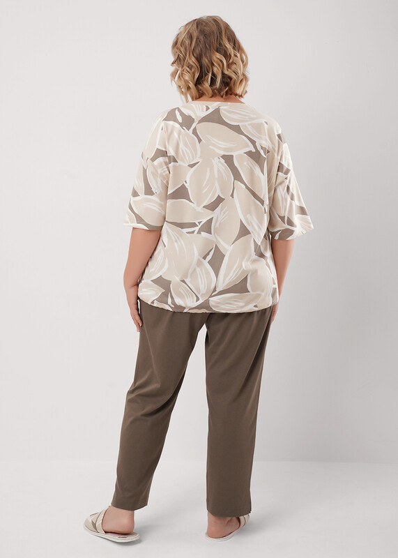 Набор одежды из трикотажного полотна с модалом.Джемпер с коротким цельнокроенным рукавом.Округлая горловина с обтачкой.Спереди рельефы,принт.По низу кулиса из окантовки.Брюки длиной 7/8,с поясом на резинке.Боковые карманы с отрезным бочком,внизу разрезы.