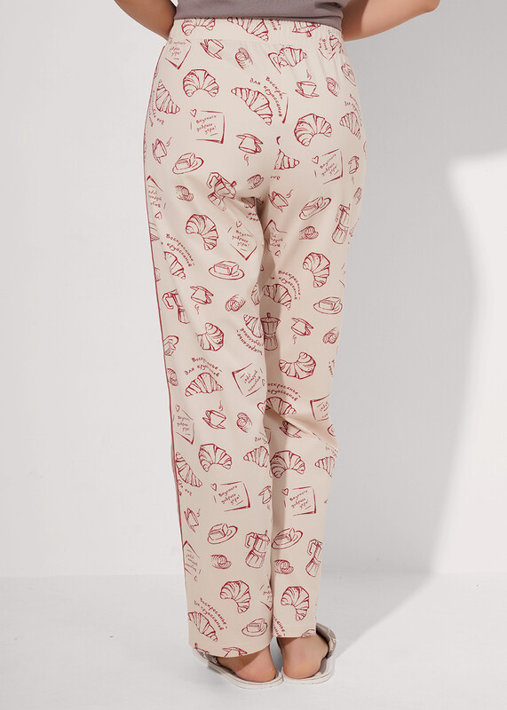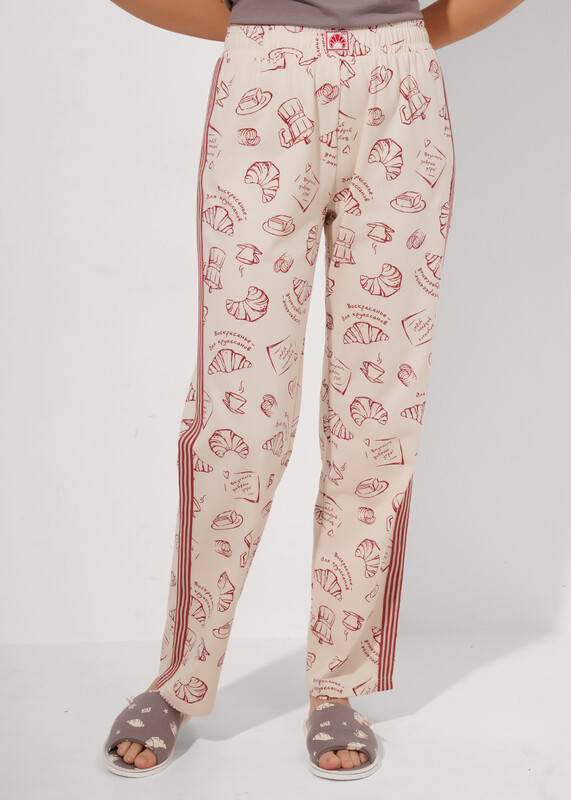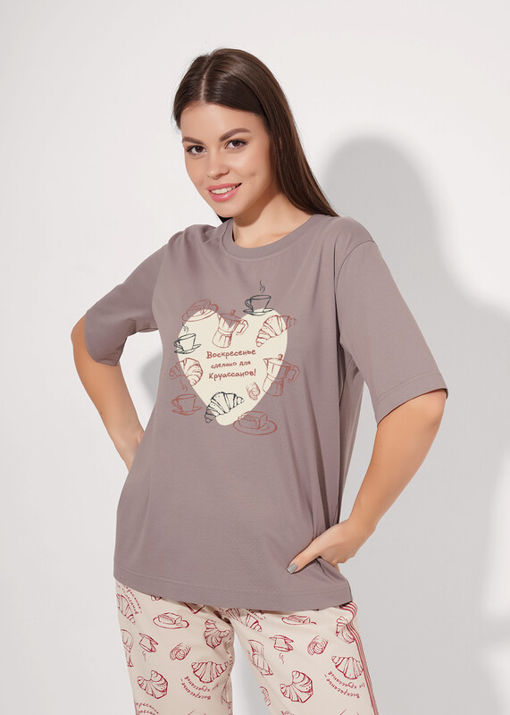 Набор одежды для дома и отдыха из хлопкового трикотажного полотна. Футболка прямого кроя. Короткий втачной рукав. Округлая горловина с обтачкой. Спереди принт. Брюки с поясом на внутренней резинке, по боковому шву -лампас из тесьмы, спереди нашивка.