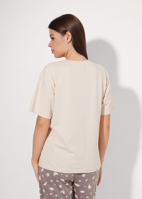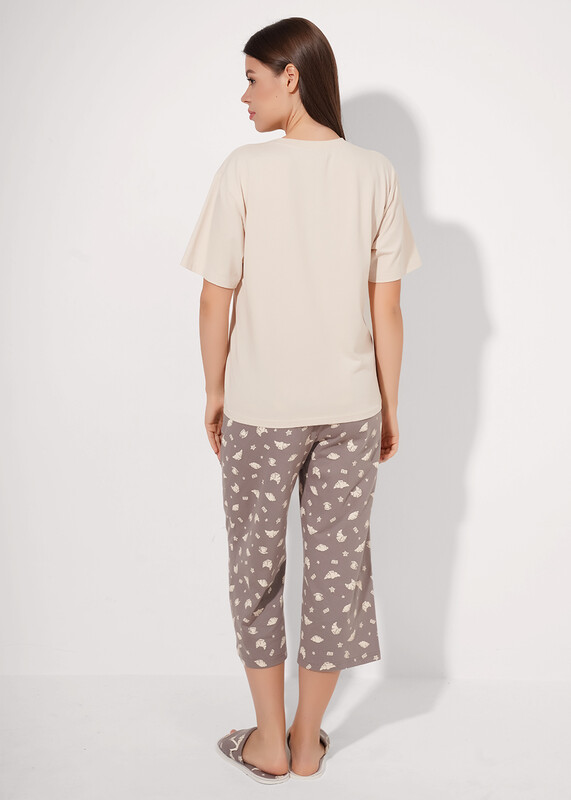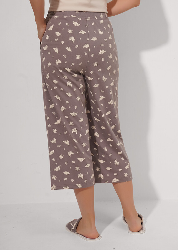 Набор одежды для дома и отдыха из хлопкового трикотажного полотна. Футболка прямого кроя. Короткий втачной рукав. Округлая горловина с обтачкой. Спереди принт. Бриджи с поясом на внутренней резинке, спереди нашивка. Боковые карманы с отрезным бочком.