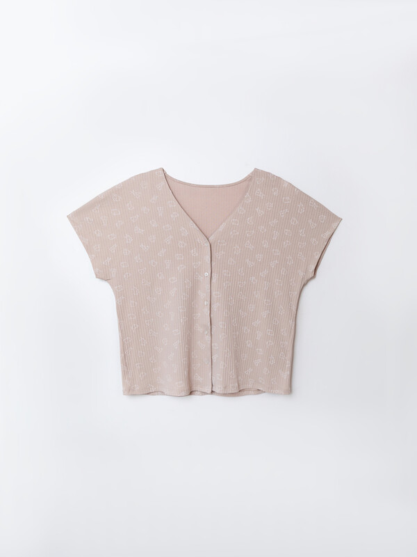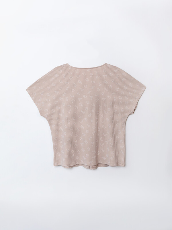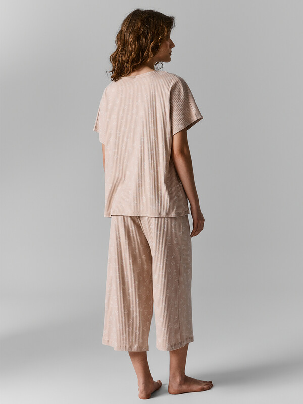 Комплект женский состоит из джемпера и брюк. Джемпер прямого силуэта. Горловина V-образной формы. Рукава цельнокроеные короткие. По переду центральная застежка на петли и пуговицы. Горловина спинки обработана бейкой из основного полотна. Борта обработаны подбортами. Нижние срежы джемпера и рукавов обработаны швом вподгибку. Джемпер с держателями из репсовой ленты, 5мм. (SFLR-3, Арт. поставщика 9672). Бриджи прямые свободные, посадка средняя. Пояс цельнокроеный с эластичной тесьмой внутри (внутр. 30мм 30RV). Брюки с боковыми швами. Нижний срез обработан швом вподгибку.