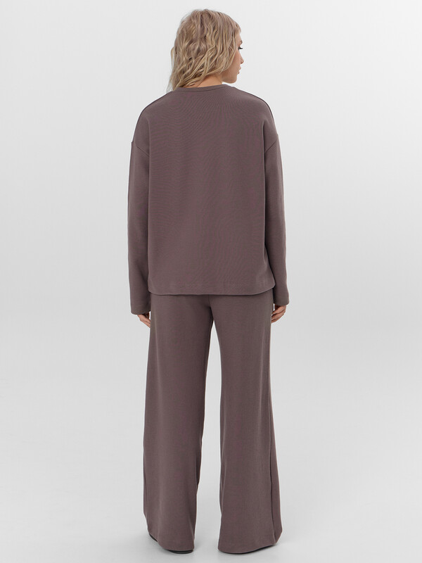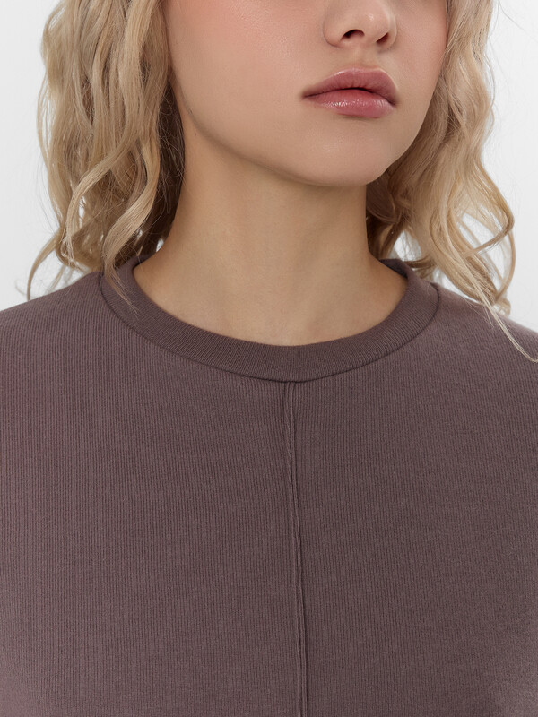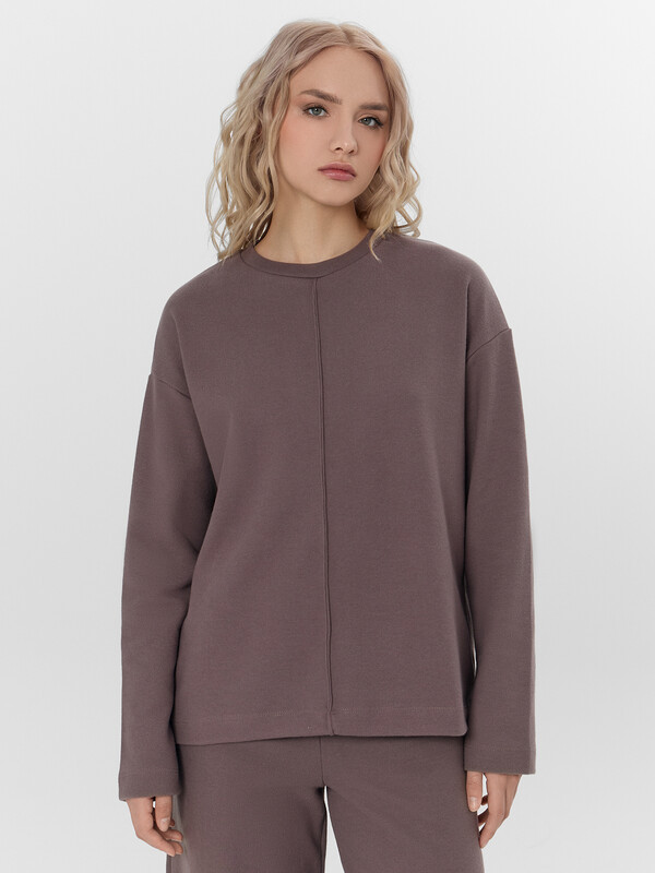 Джемпер свободного силуэта. Горловина обработана обтачкой из рибаны. Перед с отстроченным центральным швом, спинка цельнокроеная. Рукав длинный, втачной. Низ изделия и рукавов обработаны швом в подгибку.
