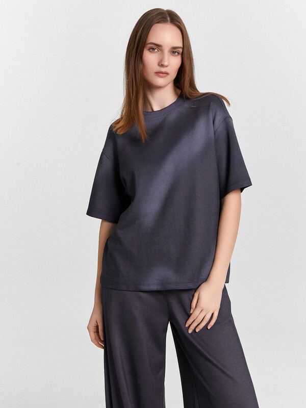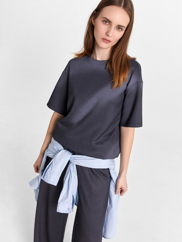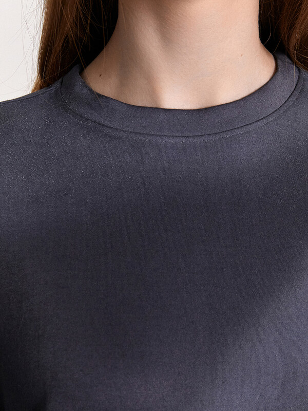 Джемпер свободного силуэта. Горловина круглой формы, обтачка из основного полотна. По горловине проложена отделочная строчка.