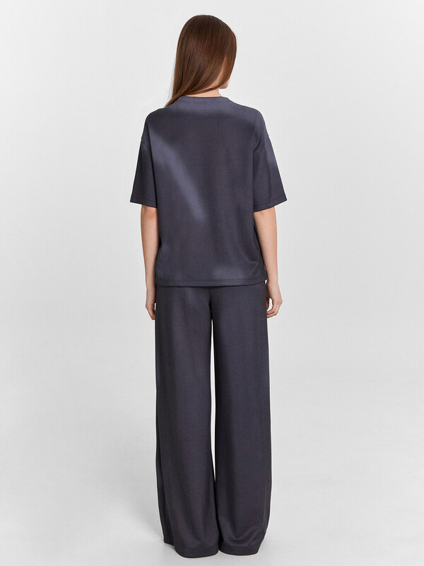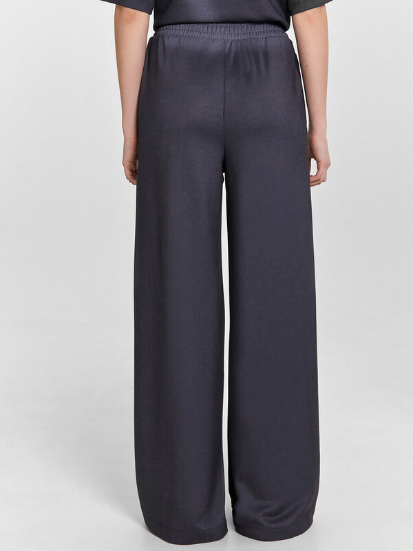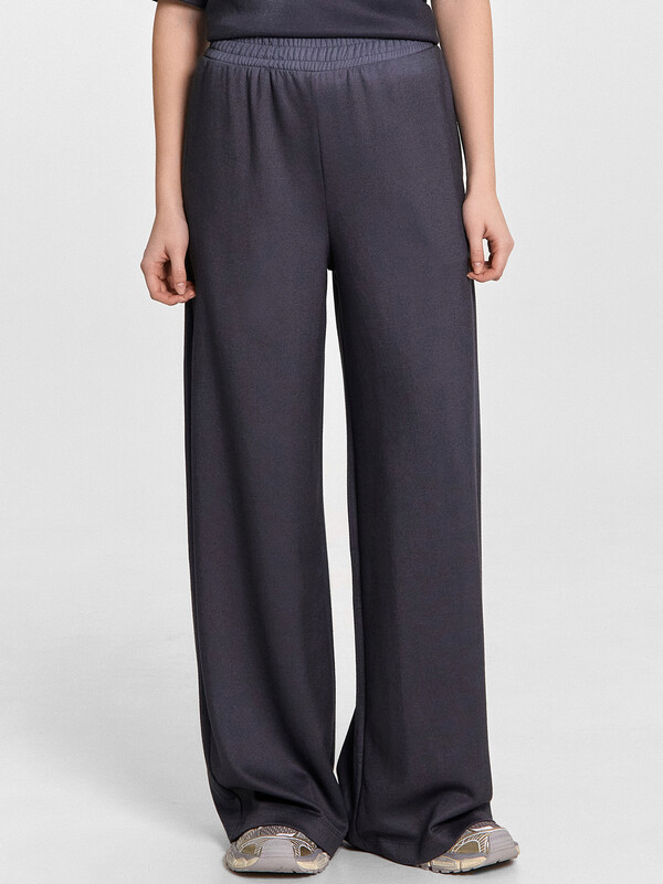 Брюки свободного силуэта, немного расширяются к низу. Пояс отрезной, с эластичной тесьмой внутри. По поясу проложены отделочные строчки.