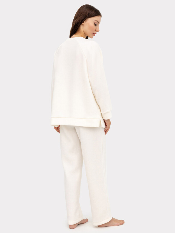 Брюки с посадкой на талии, прямого силуэта. Пояс цельнокроеный с резиной внутри. Низ брюк обработан швом в подгибку.