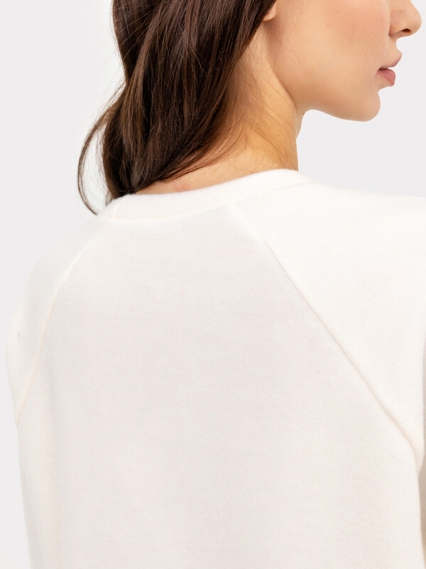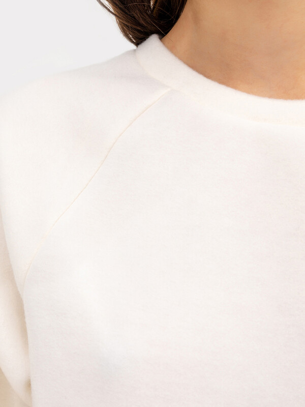 Джемпер женский свободного силуэта. Горловина круглой формы с обтачкой из основного полотна. Рукава реглан, с отрезной манжетой по низу. В боковых швах обработаны разрезы. По низу джемпера отрезной пояс.