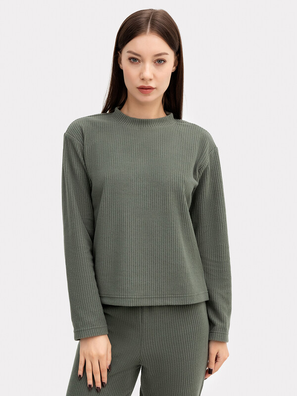 Джемпер женский свободного силуэта. Горловина круглой формы с обтачкой из основного полотна. Рукав спущенный. Рукава и низ джемпера обработаны швом в подгибку.