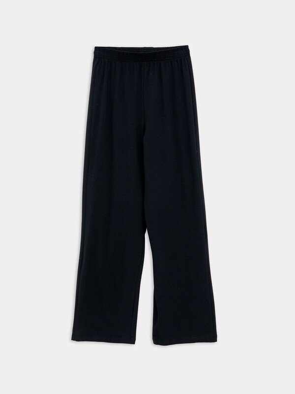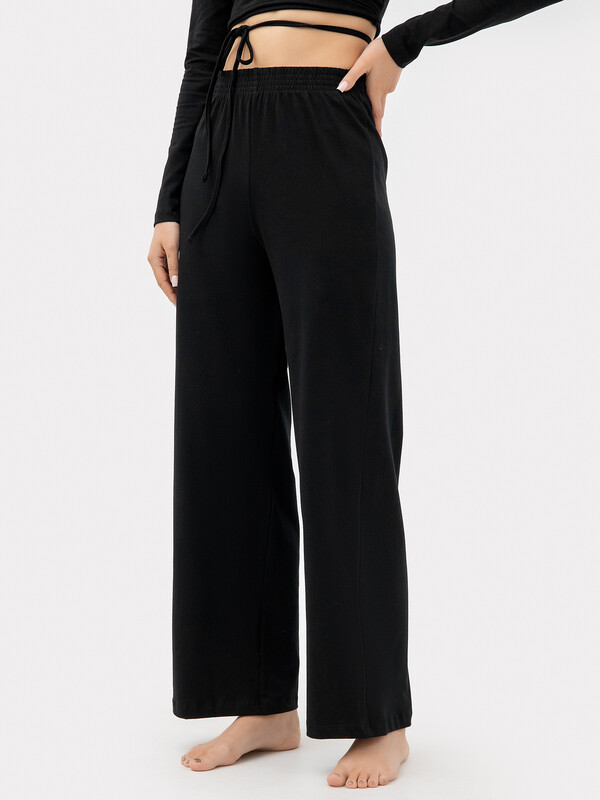 Брюки с посадкой на талии свободного силуэта. Пояс цельнокроеный с резиной внутри. Низ изделия застрочен швом в подгибку.
