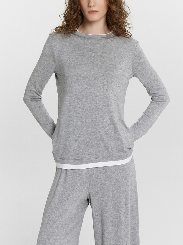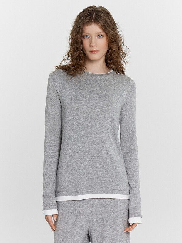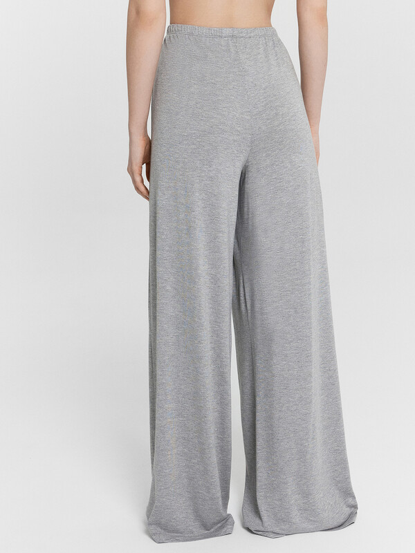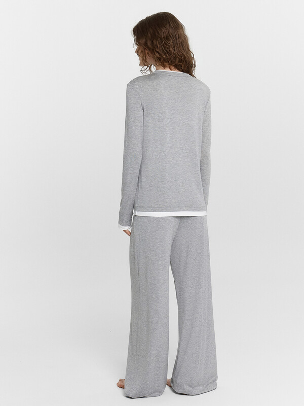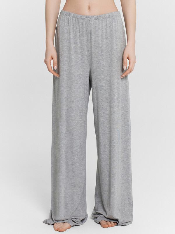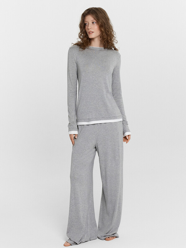 Комплект состоит из джемпера и брюк. Джемпер полуприлегающего силуэта. Горловина круглой формы обработана обтачкой из основного полотна, с имитацией двойной обтачки. Рукава втачные длинные. По низу рукава и джемпера отрезная деталь имитация поддетого джемпера. Брюки прямые свободные. Посадка средняя. Пояс цельнокроеный с эластичной тесьмой внутри (внутр 20мм 20RV). Нижний срез обработан швом вподгибку.